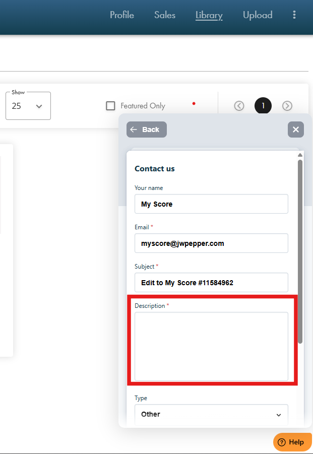 If submitting using the edit function or "Help" widget in your My Score profile, please include your description, price, or title/subtitle update in the "Description" box pictured below:
